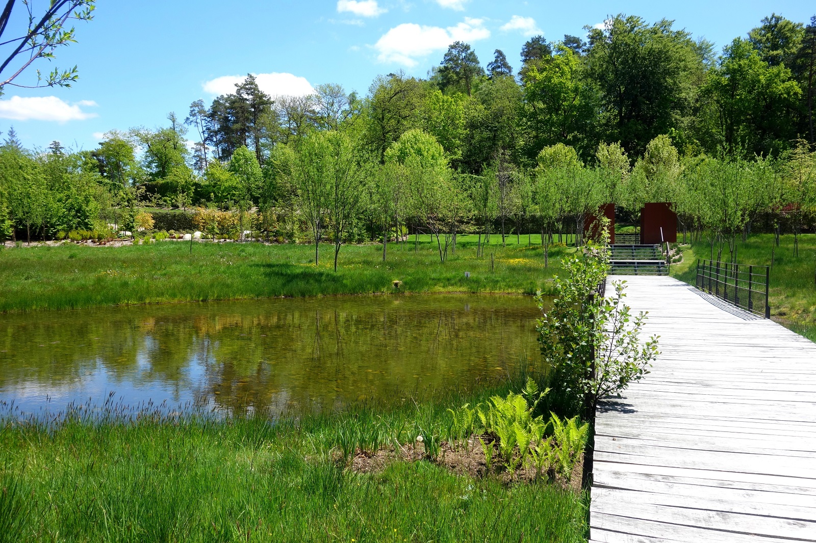 La passerelle vous invite à déambuler à travers la prairie et au-dessus des plans d’eau, sans perturber l’espace.